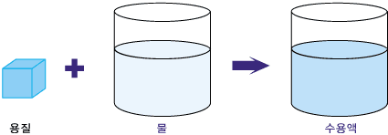 용질, 소금과 같이 다른 물질에 녹는 물질. 용매, 물처럼 다른 물질을 녹이는 물질. 용해, 소금이 물에 녹는 것처럼 어떤 물질이 다른 물질에 녹아 골고루 섞이는 현상. 용질, 용매, 용해, 용액의 개념