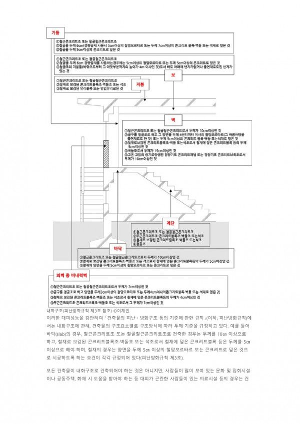 방화지구 안의 건축 내화구조 국토의 계획 및 이용에 관한 법률에 따른 방화지구 안에서는 건축물의 주요구조부와 외벽을 내화구조로 하여야 한다. 다만, 대통령령 방화지구 안의 건축